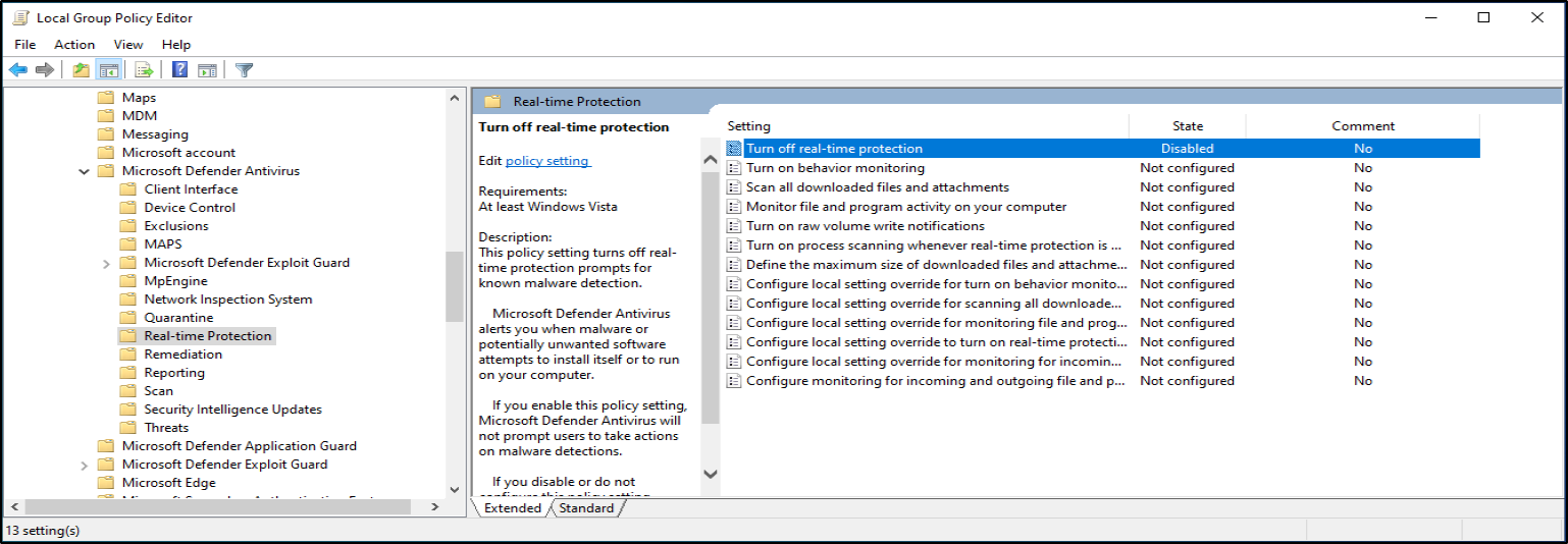 Expanding "Microsoft Defender Antivirus," click on "Real-time Protection" and change "Turn off real-time protection" to Disabled. Restart the computer.