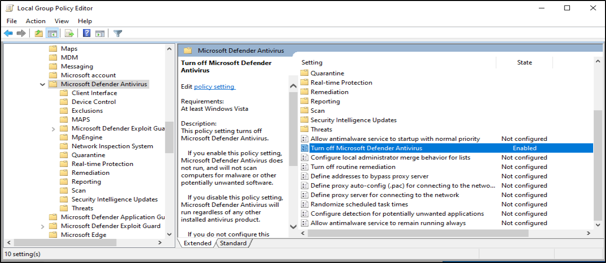 Then, set "Turn off Microsoft Defender Antivirus" to Enable. Note: Enabling this DISABLES the Antivirus. See below.