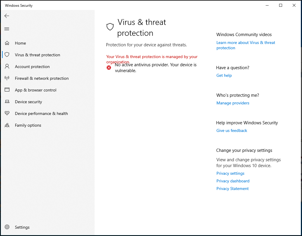 Then, hit Windows Key + R and type "windowsdefender:" and choose "Virus & threat protection." You should see a screen as below: