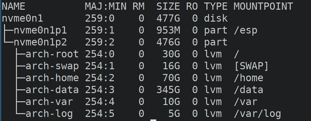Here is the partition that I used. It's using LVM (no encryption -- yet). Most of the space is given to the /data partition and I attempted to minimize the space for each mount location.