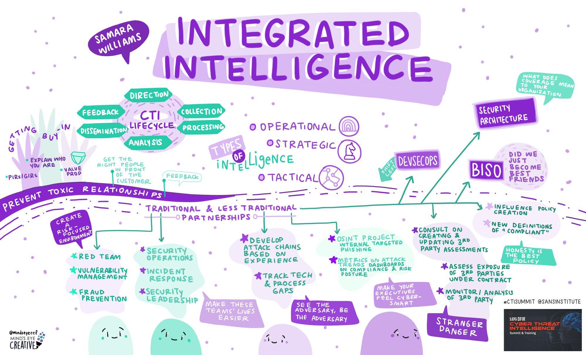 Samara's talk centered around out of the box thinking and to include all area of businesses such as Business Informaiton Security Officers (BISO), GRC, and other units. If you want to know how to get upper-level management to understand the importance of CTI, watch her talk. Samara says, "CTI and BISOs should be married and get their vows renewed every few years."